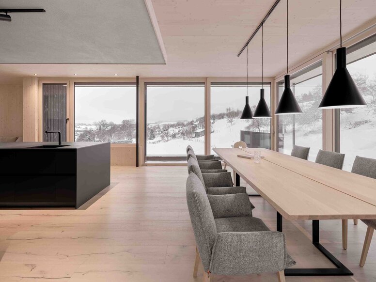 Der Essbereich öffnet sich durch große Panoramafenster zur umgebenden Natur und schafft so eine fließende Verbindung zwischen Innenraum und Landschaft. Ein großer, heller Holztisch, graue Polsterstühle und schwarze Pendelleuchten über dem Tisch unterstreichen die klare, zeitlose Gestaltung des Raumes.
