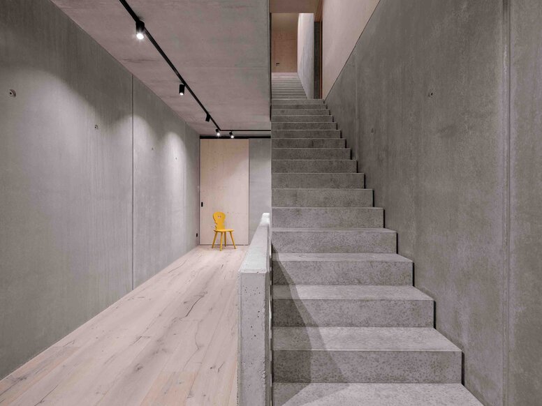 Die helle Holztür mit HEWI-Beschlag und der sonnengelbe Holzstuhl setzen gezielte Akzente, die die Materialität von Beton und Holz auf subtile, aber prägnante Weise unterstreichen.