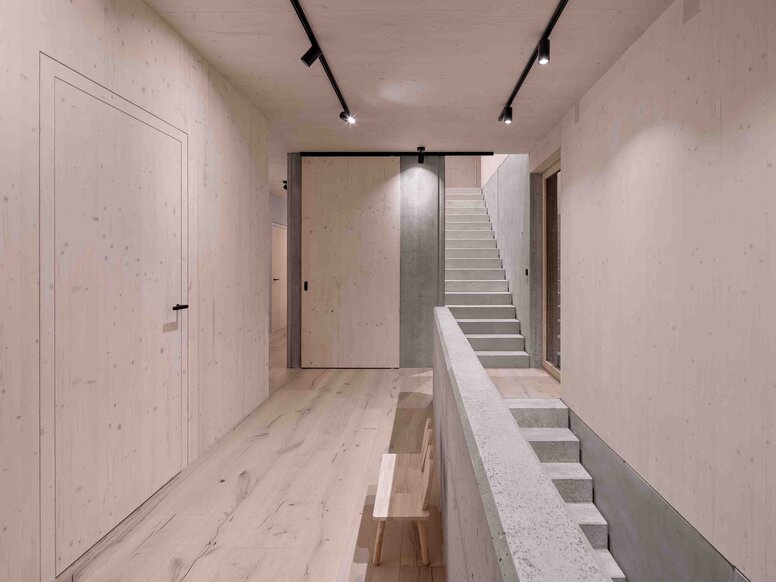 Das Grundstück liegt am Übergang von einer gewachsenen Dorfstruktur zu einer offenen Landschaft. Hier steigt das Gelände steil an, was eine ebenso komplexe wie inspirierende Komponente schafft. Anstatt das Gelände zu nivellieren, reagiert die Architektur auf die vorhandene Topografie: Zwei massive Sockelgeschosse aus Sichtbeton nehmen die Höhenunterschiede auf, beherbergen Erschließungs- und Funktionsräume und vermitteln mit ihrer introvertierten Präsenz Erdverbundenheit und Ruhe. Darauf aufgesetzt öffnen sich zwei leichte Geschosse in Brettsperrholz-Massivbauweise (BSP/CLT) zur Umgebung. „Es geht darum, der Landschaft nicht etwas entgegenzusetzen, sondern ihre Kraft aufzunehmen“, erklärt Schönauer. So entsteht eine klare räumliche Staffelung: unten zurückhaltend und geschützt, oben offen, hell und weitblickend.