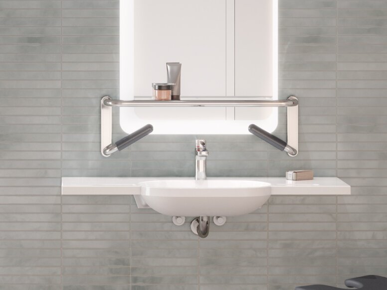 Die Spiegelablage mit integrierten Griffen bietet sicheren Halt. Mit Hilfe der Griffe kann sich der Patient selbstständig am Waschtisch aufrichten und findet sicheren Halt im Sitzen und im Stehen. Die Haltegriffe sind aus hochwertigem Polyamid gefertigt, das eine besonders angenehme Haptik aufweist.