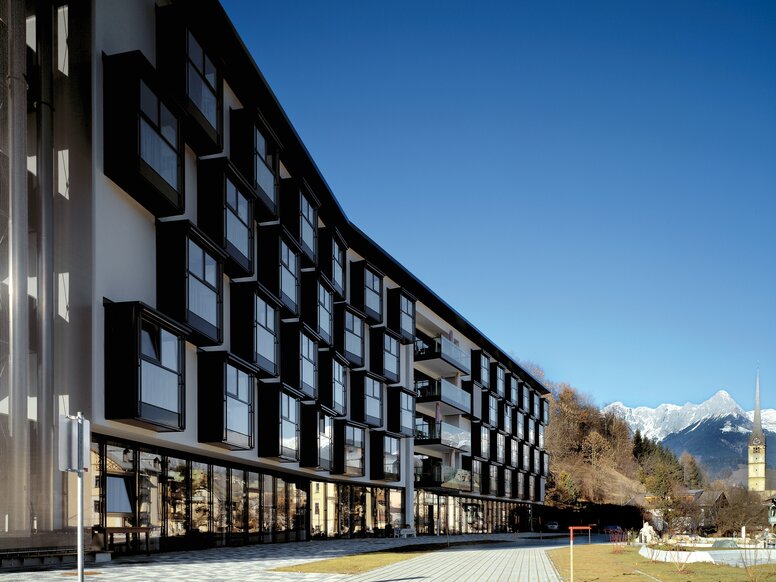 Der neue Erweiterungsbau setzt bewusst einen architektonischen Kontrast, ohne den Bestand zu dominieren. Ein trichterförmiges Portal markiert die neue Adresse und leitet über eine präzise, weiße Raumfolge ins Innere. Großzügige Verglasungen öffnen das Ensemble zur Stadt hin, während anthrazitfarbene Fassadenflächen und Eichenparkett-Böden eine robuste und zugleich elegante Materialität etablieren. Diese moderne Architektursprache nimmt Proportionen und Rhythmen des Bestands auf, interpretiert sie jedoch zeitgenössisch weiter – und stärkt damit die Lesbarkeit des Ensembles. Das Foyer verbindet Alt- und Neubau zu einem fließenden Raumkontinuum und schafft ein Gefüge, das funktional wie atmosphärisch auf Begegnung ausgelegt ist.