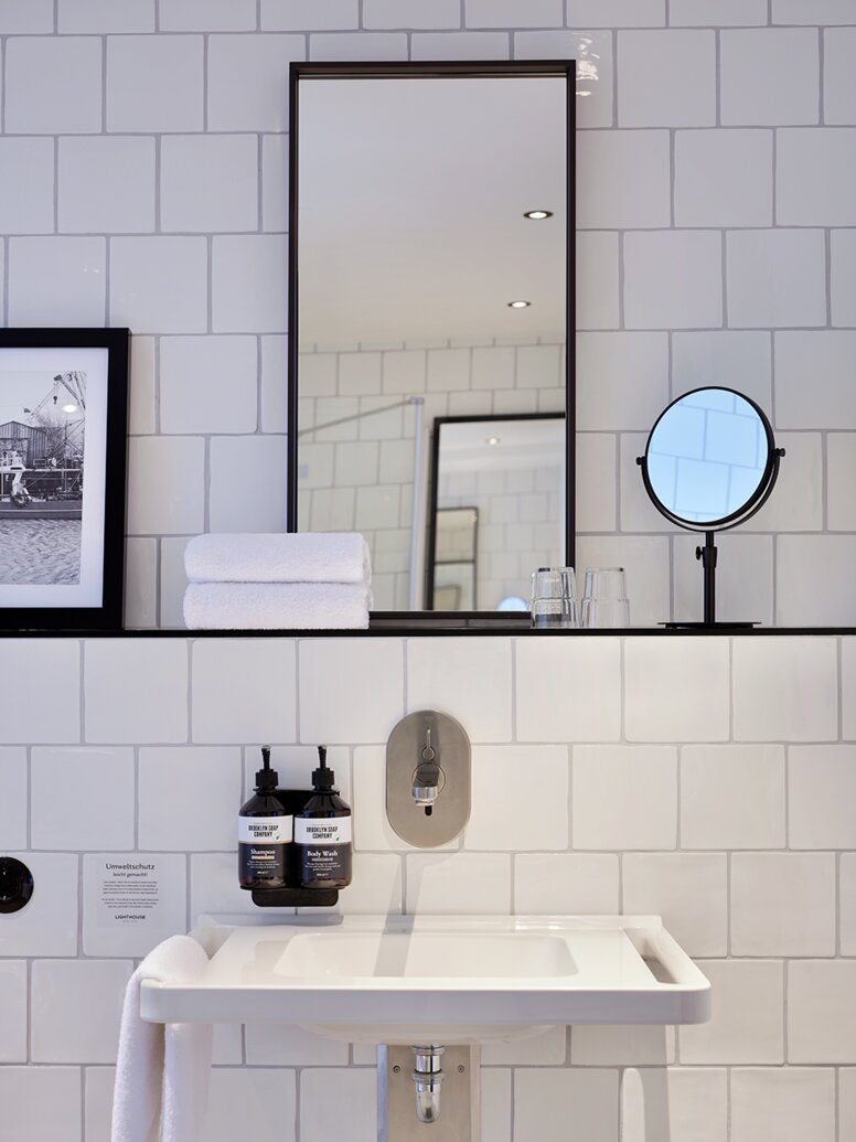 Als es darum ging, die Bäder hochwertig auszustatten, fiel die Wahl von Sroka auf HEWI. Hohen Wert legte man auf Aussehen, Haptik und Qualität der Produkte. Sie sollten über eine erstklassige Haltbarkeit und die richtige Oberfläche verfügen. Denn schwarze Bau- und Designelemente ziehen sich wie ein roter Faden durch die Gestaltung des Hotels. Harmonisch integrieren sich die HEWI Lösungen von System 900 daher in die Hotelbäder und barrierefreien Sanitärräume.