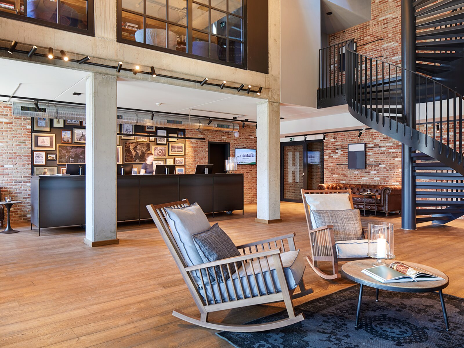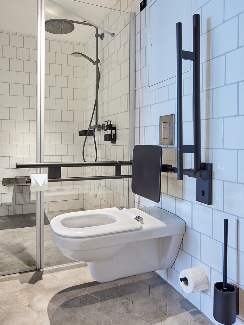 Die HEWI Produkte von System 900 mit einer eleganten dunklen Pulverbeschichtung fügen sich in das Industriedesign aus rotem Backstein und mattschwarzen Elementen des Innendesigns ein und ermöglichen eine stilvolle Gestaltung barrierefreier Hotelbäder.