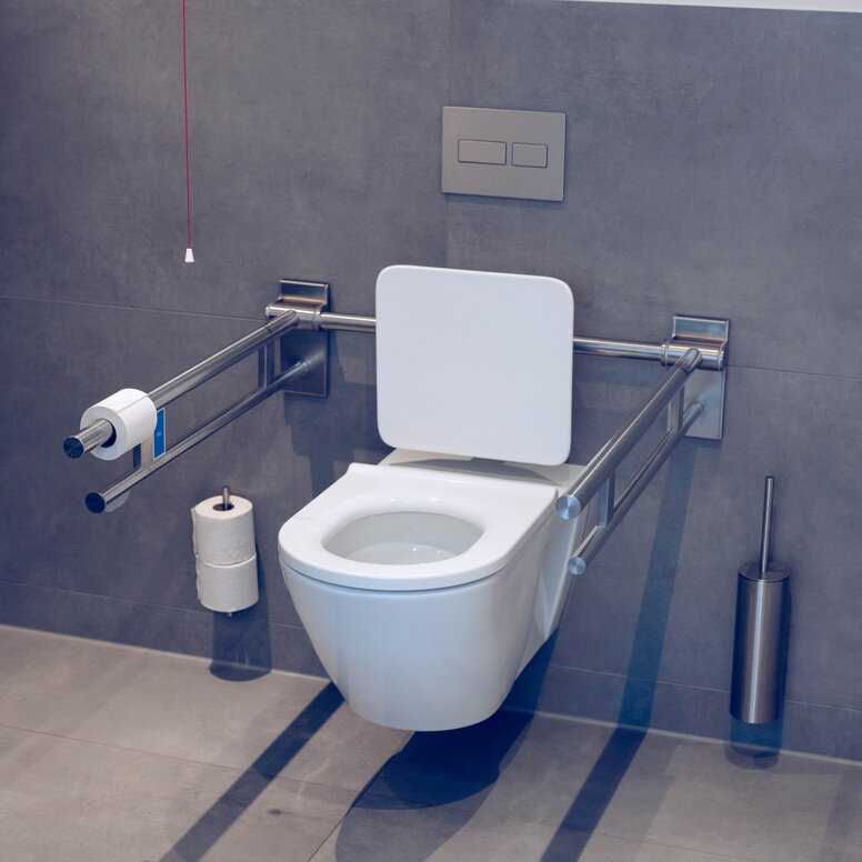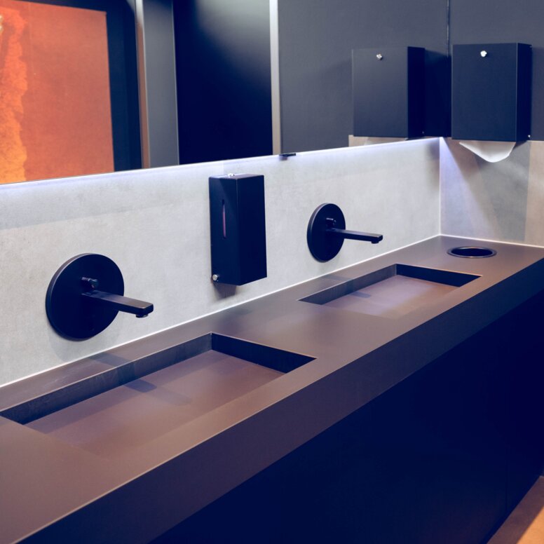 The durable and robust accessories from HEWI System 900 were also chosen to match the black matt HEWI door fittings, as well as the black washbasin fittings and dark surfaces in the new washrooms: HEWI Sensoric soap dispensers, paper towel dispensers, waste bins and toilet brush sets are used, all of which are made of high-quality stainless steel and powder-coated in elegant deep matt black. System 900 meets the requirements of a wide range of building types, especially in highly frequented locations such as public buildings and restaurants, and impresses with its functionality, durable quality, clever installation technology and hygienic design. The folding support rail in the WC is also from the 900 series, which was essentially developed for accessible bathrooms and offers an impressive combination of reliable quality and sophisticated technical details.