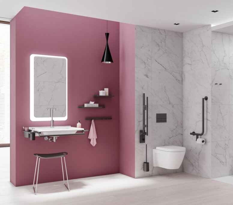 With the supportive products of the WARM TOUCH design, planners can offer maximum comfort. WARM TOUCH combines the optical properties of high-gloss chrome surfaces with the haptic properties of polyamide and thus offers an alternative to conventional, cold chrome products. For patients with increased sensitivity to cold or older people in particular, the warm alternatives are more comfortable to grip and are an ideal solution in terms of healing architecture.