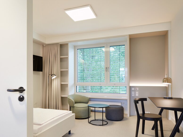 “The treatment concept is geared towards the realities of life and prepares patients specifically for everyday situations,” explains Dr Matthias Wilkening, Managing Partner of Wahrendorff. For example, there are various everyday training locations such as utility rooms and a “launderette”. The architecture of the building, with its skilful combination of indoor and outdoor spaces and a variety of lounges and meeting areas such as terraces, loggias, corridor extensions and group rooms, supports guests' needs for private and sheltered retreats or for social interaction. There are many opportunities here to find your way back into public life at your own pace.