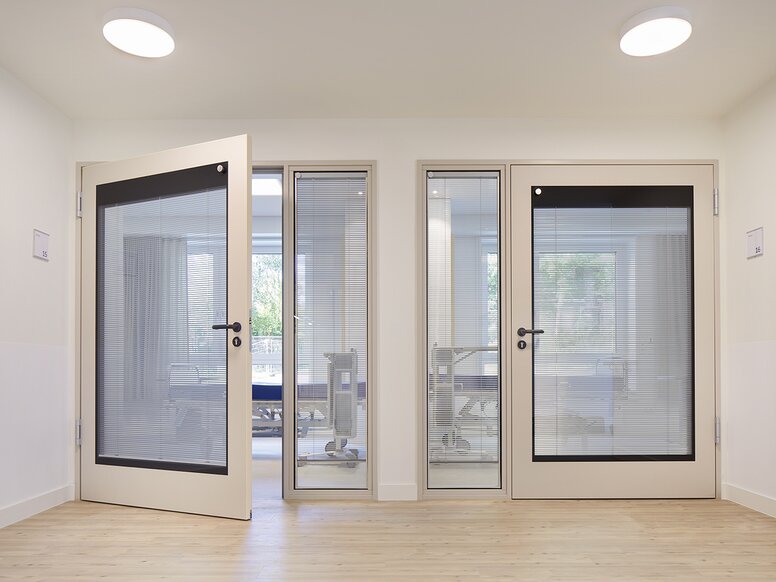 On room doors, the classic HEWI lever handle System 111 – in a matt black finish – is like a statement in itself. The design language of the lever handle, reduced to the essentials, blends seamlessly into the timelessly modern architecture of the hospital and at the same time forms a maximum colour contrast to the white doors – sometimes in combination with a round WC-type or key escutcheon and in optional areas with an electronic lock cylinder.