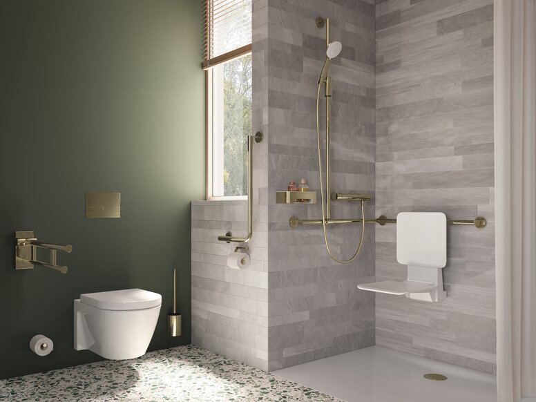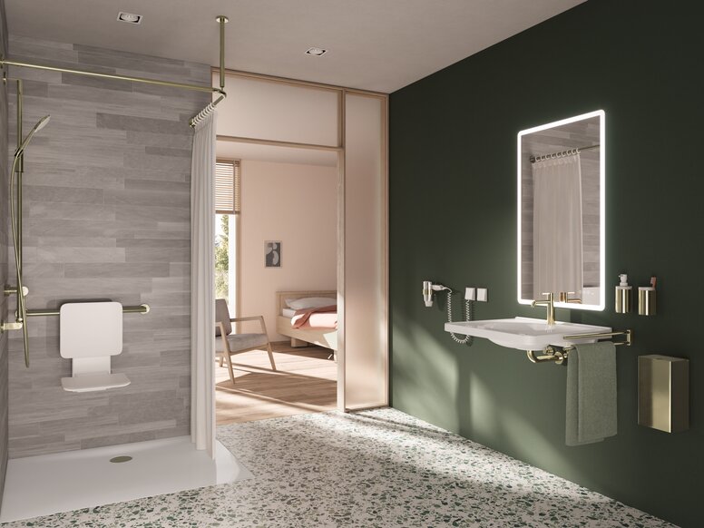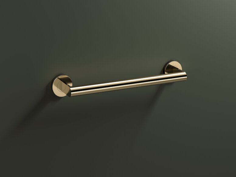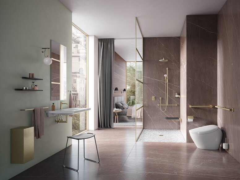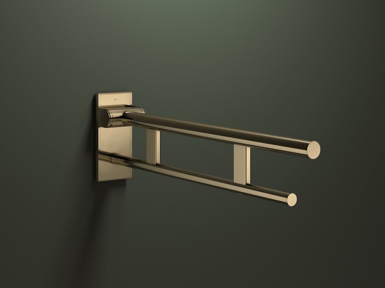 Elegance in the barrier-free sanitary room. The tried and tested HEWI hinged support rail in brass glossy brings warmth and cosiness to the bathroom.