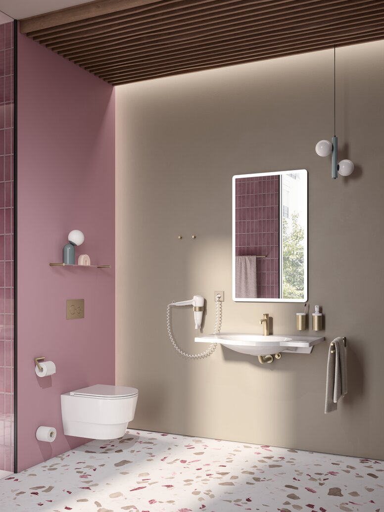 Guests also want a welcoming atmosphere in hotel sanitary rooms. With the new special and standard colours, including brushed brass, HEWI now offers even greater scope for planning.
