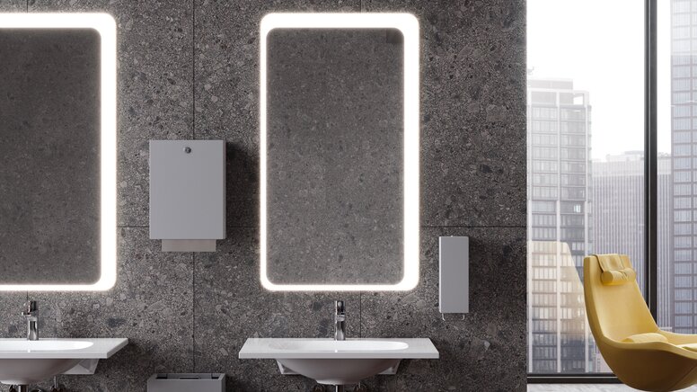 There is a choice of models with powder coating in black, grey tones and white, as well as stainless steel variants. The dispensers are characterised by their robustness and are perfectly suited for use in heavily frequented sanitary rooms. The majority of the dispensers are available in a sensoric version in addition to manually operated versions. From soap and disinfectant dispensers to paper towel dispensers and waste containers through to hygiene combinations in various sizes, HEWI offers a consistent, functional range that is also characterised by the highest design standards.
