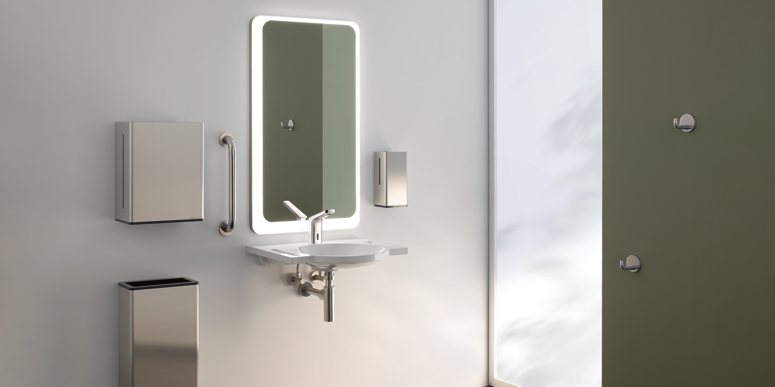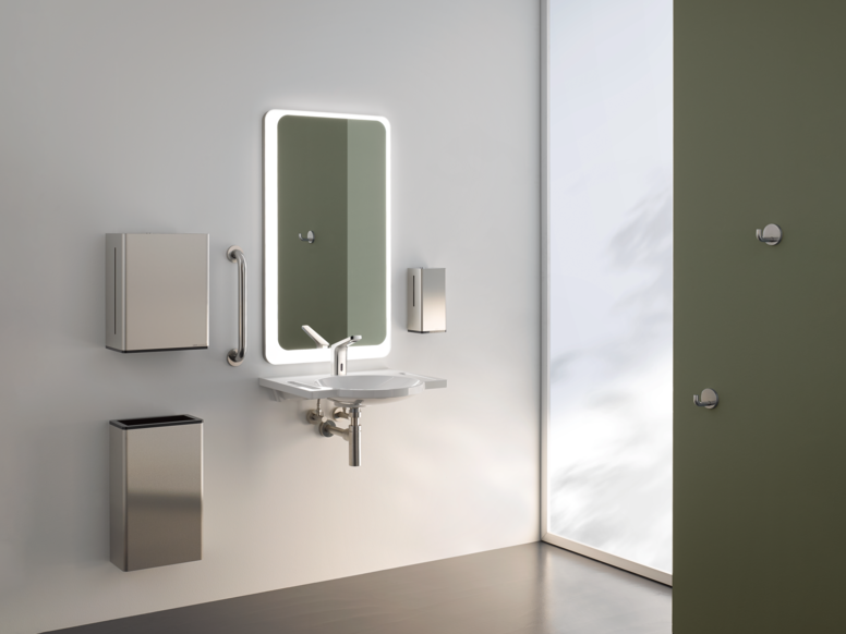 - From washbasins and accessories to fittings, hinged support rails and seats