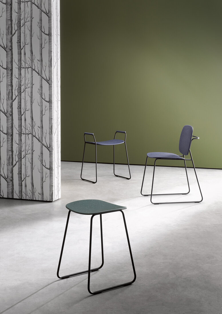 HEWI's new Re-seat family consists of three stools and two bathroom chairs and is made from post-industrial recyclate, some of which comes from HEWI itself and some sourced from a regionally based producer. In the natural colours forest green and dark granite grey, they offer an exciting and vivid look and feel.