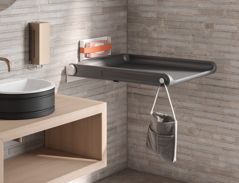 Nowy przewijak dla niemowląt HEWI łączy w sobie łatwą do czyszczenia matę wykonaną z pianki PUR w kolorze szarym stalowym z solidnymi metalowymi elementami w kolorze białym matowym. Funkcja składania z hamulcem umożliwia płynną obsługę, a boczne zaczepy i schowek na zacisk zapewniają dodatkowy komfort. Przewijak łączy w sobie najwyższe standardy bezpieczeństwa i wygodną obsługę z nowoczesnym designem, który doskonale nadaje się do zastosowania w publicznych strefach sanitarnych. Stolik do przewijania został zaprojektowany przez Holscher Design, renomowaną i wielokrotnie nagradzaną agencję zajmującą się strategicznym projektowaniem produktów z Danii, posiadającą ponad 50-letnie doświadczenie.